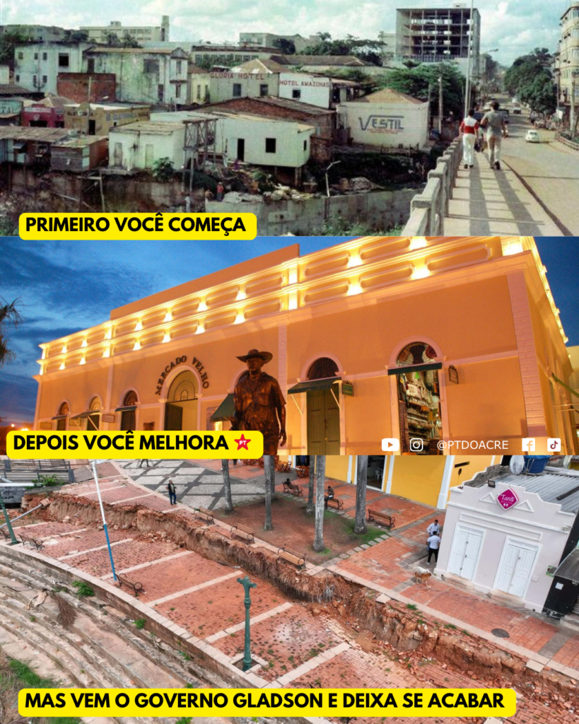 As imagens evidenciam locais emblemáticos, como o Mercado Velho, a Gameleira e o Mercado dos Colonos, que passaram por processos de revitalização durante os governos petistas, tornando-se pontos turísticos e culturais importantes para a população. No entanto, os registros mais recentes mostram calçadas esburacadas, estruturas comprometidas e a degradação acelerada desses espaços. A postagem responsabiliza diretamente a gestão de Gladson Cameli, apontando a ausência de políticas públicas voltadas à preservação do patrimônio e a falta de continuidade dos avanços conquistados em administrações anteriores. Fato que pode ser levado a outros locais, como Biblioteca da Floresta, Teatro Plácido de Castro e outros em todo o estado.