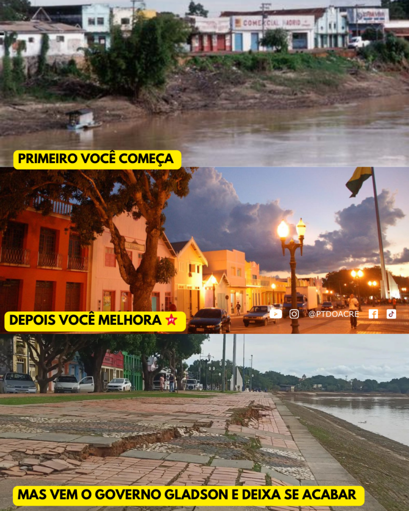 A postagem do PT do Acre e do vereador André Kamai, do PT de Rio Branco, na última quarta-feira, 19, no Instagram chamou atenção nas redes sociais ao expor o estado de abandono de espaços históricos da capital. Seguindo uma trend (tendência), a publicação utilizou uma sequência de imagens para ilustrar o antes e depois de áreas revitalizadas pelos governos do PT e, em seguida, a deterioração sob a atual gestão do governador Gladson Cameli (PP). A crítica é clara: a falta de manutenção e investimento transformou importantes patrimônios urbanos em símbolos do descaso.